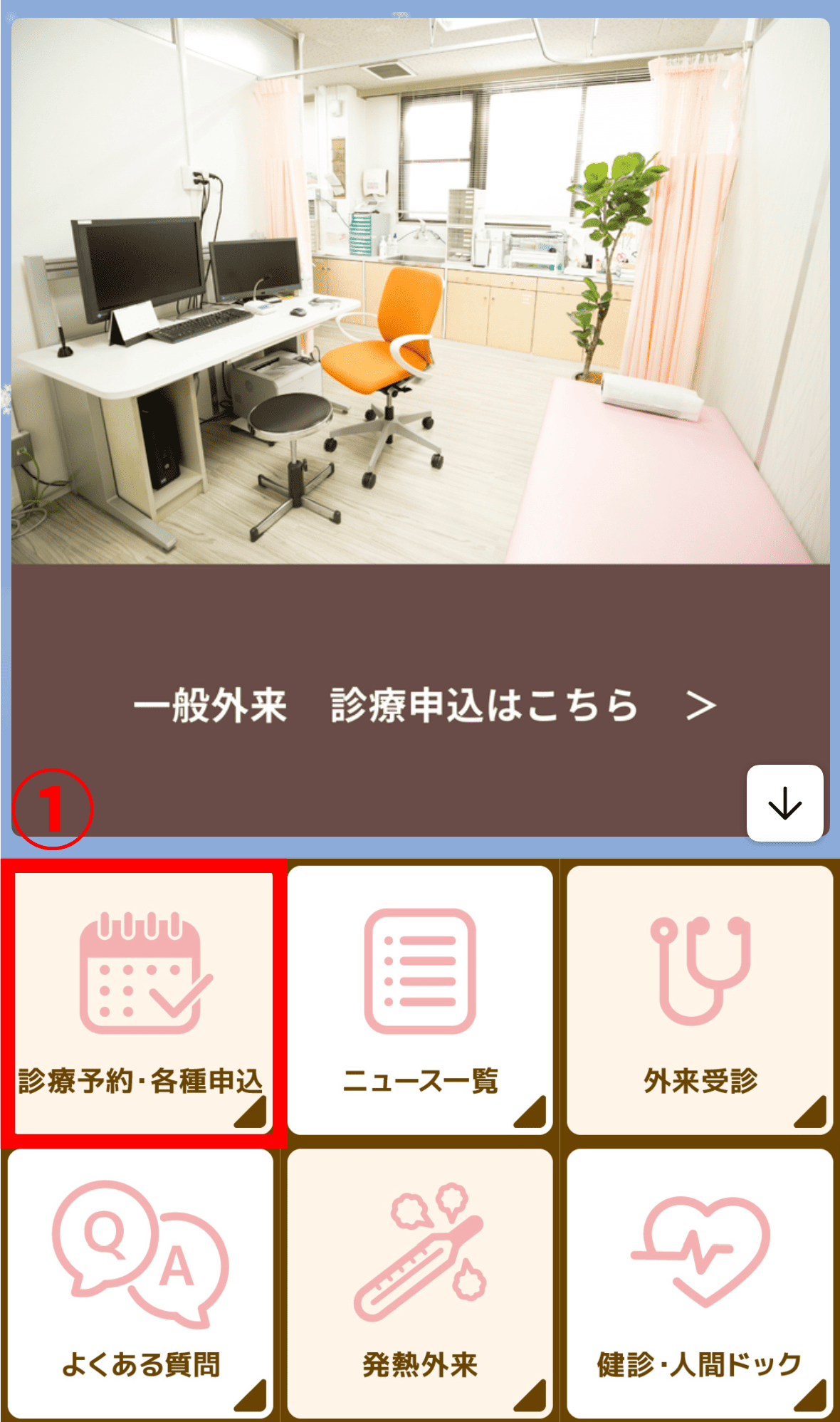 ①トーク画面のメニューより「診療予約・各種申込」を選択