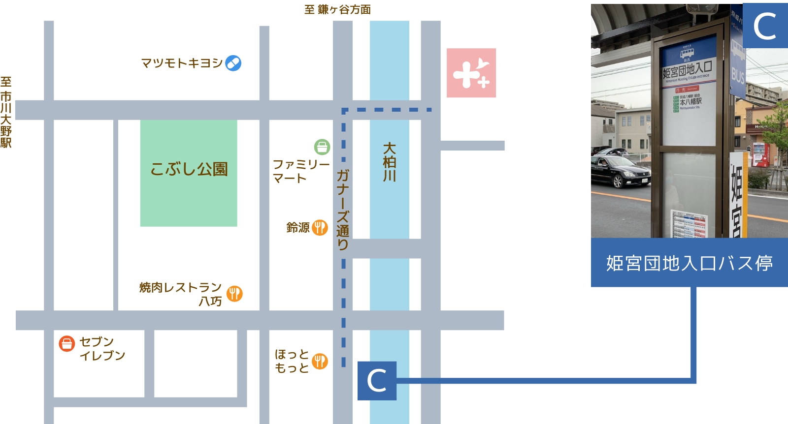 姫宮団地入口経由 本八幡駅・医療センター入口方面(約4〜6分)