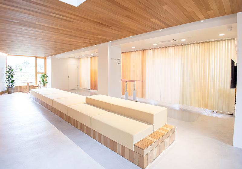 広々とした開放的な待合スペースで、ゆったりとお過ごしいただけます。夏の季節には、大きな窓から広がるひまわり畑の景色もお楽しみいただけます。