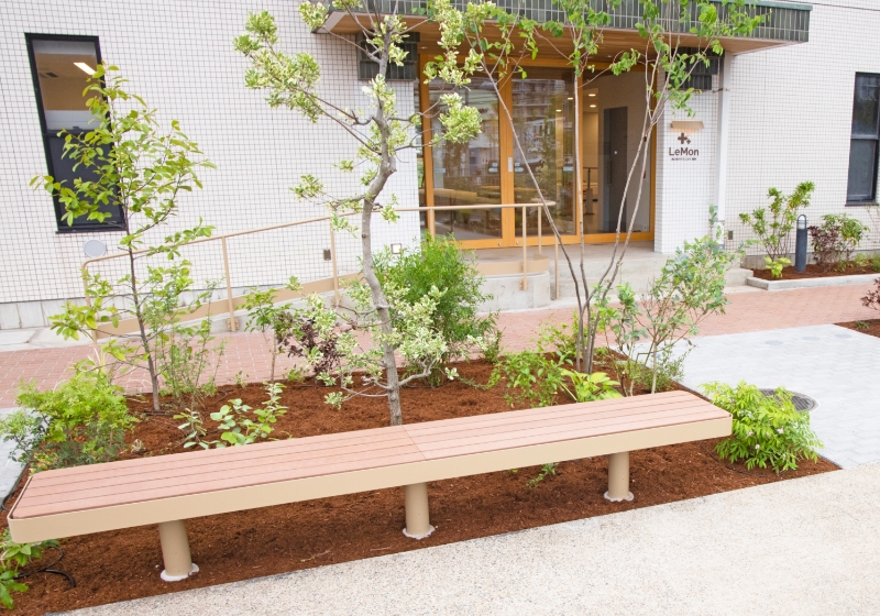 クリニックの外に、散歩途中に休憩できるベンチを設置しました。散歩の途中に、ちょっと一息つけるような気軽な場所でありたい。そんな思いを込めて、地域の皆さまにとって身近で安心できるクリニックを目指しています。